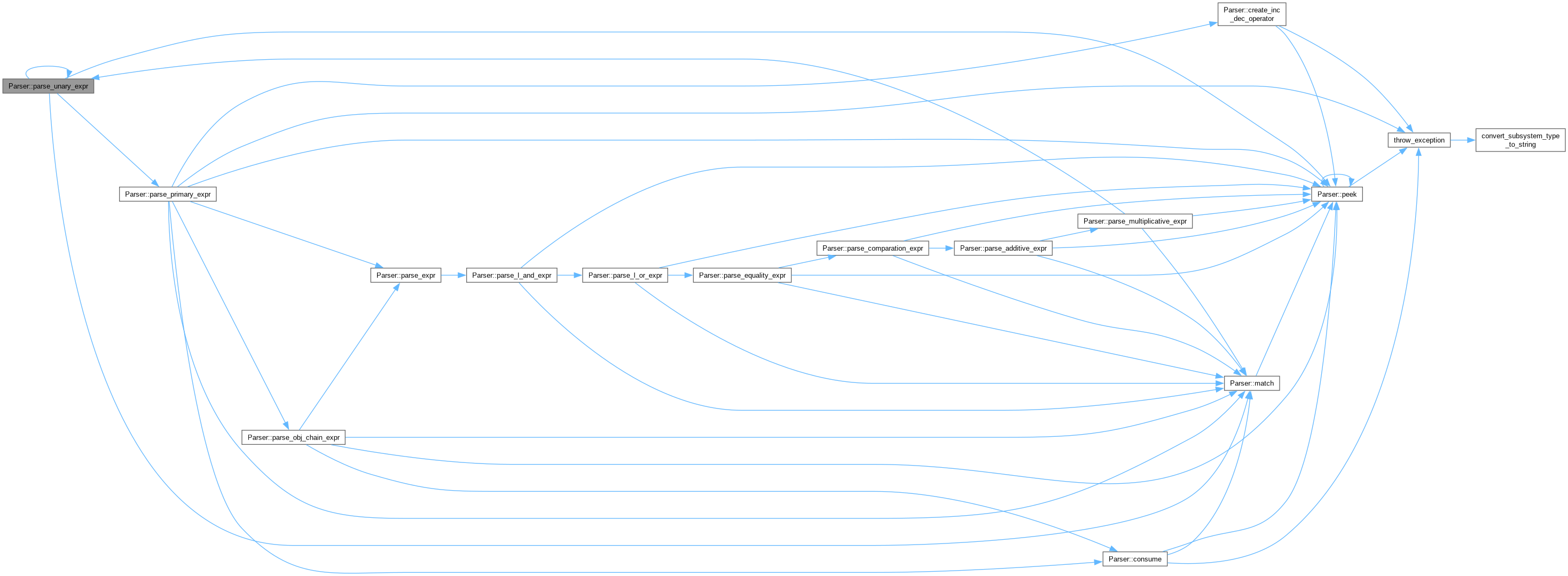 This method parsing all expressions as 'unary'. If type of current token isnt TOK_OP_L_NOT (aka !) or TOK_OP_MINUS (aka -), then returns created expression