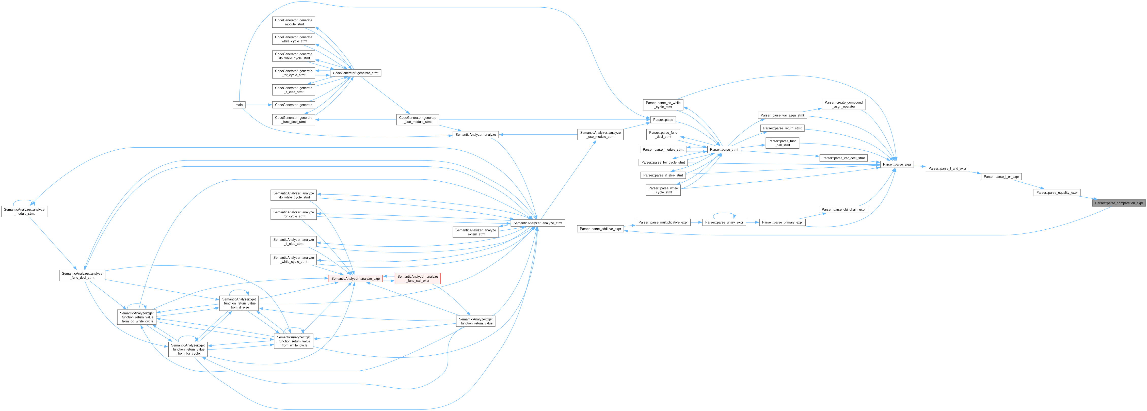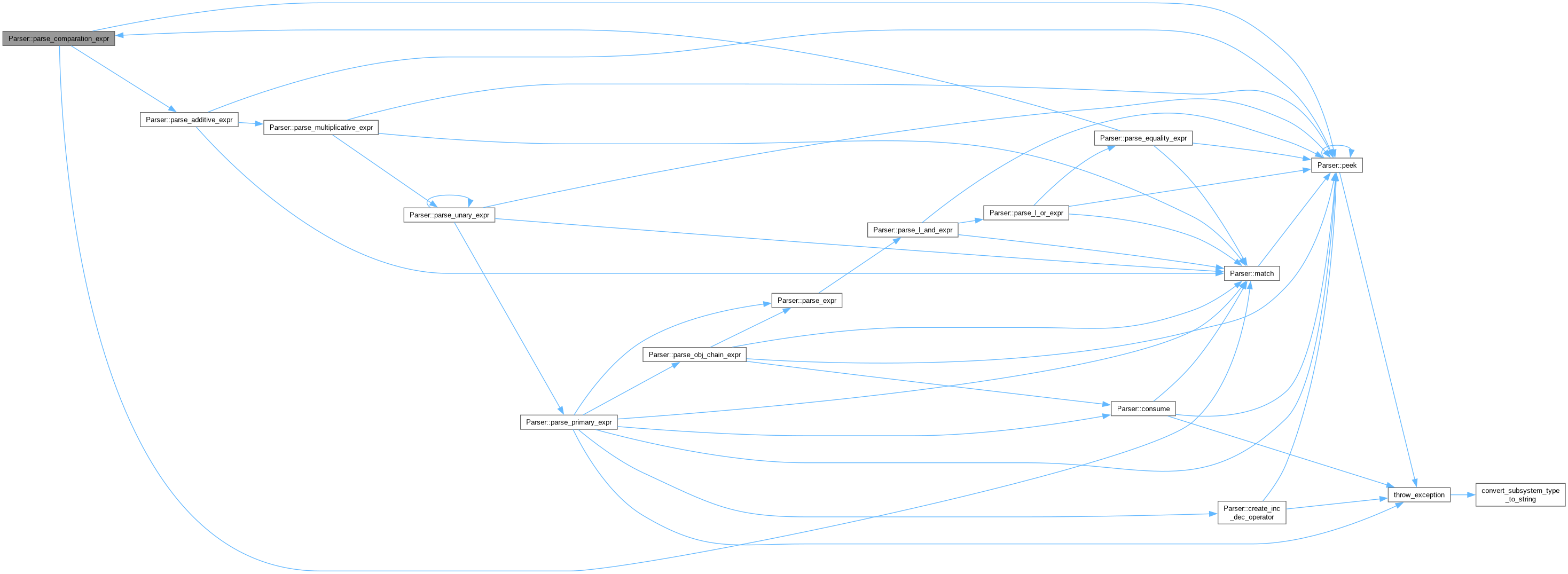 This method parsing all expressions as 'comparation'. If type of current token isnt TOK_OP_GT (aka >) or TOK_OP_GT_EQ (aka >=) or TOK_OP_LS (aka <) or TOK_OP_LS_EQ (aka <=), then returns created expression